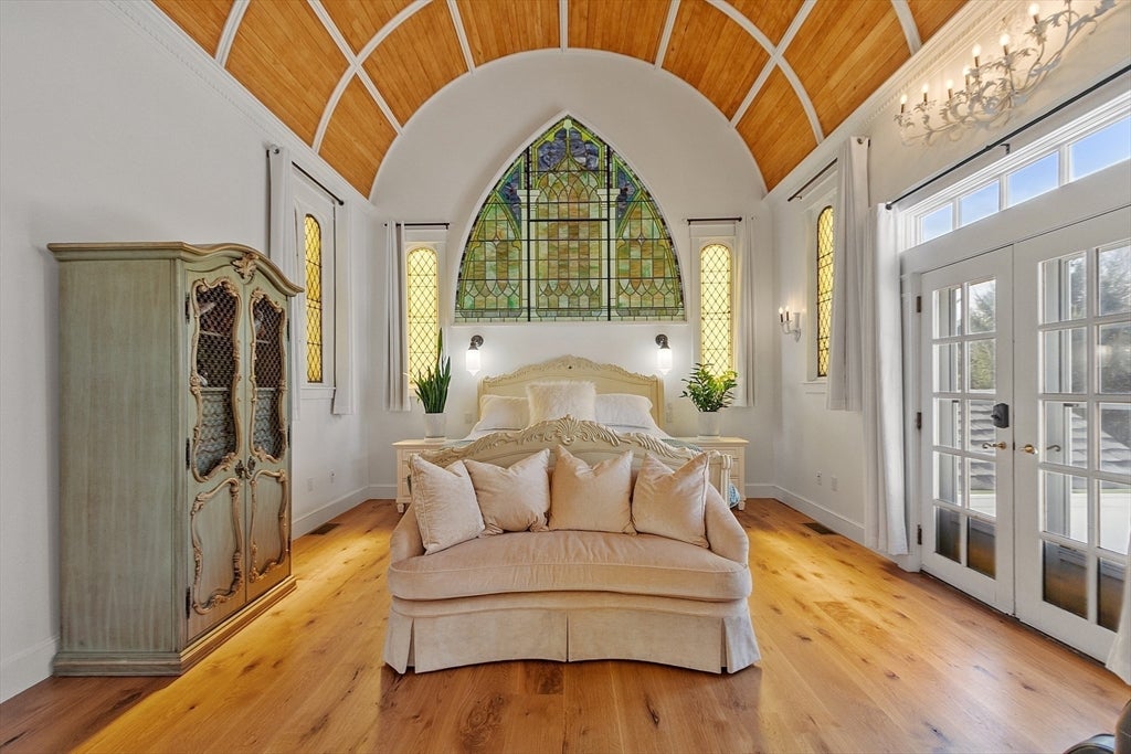 Back downstairs, to the left of the kitchen, is a door that leads down a hallway to the former sacristy, which is now the primary bedroom area. There’s a half-barrel ceiling and a large stained glass window, as well as French doors that lead outside. A private bath is spacious and features a dressing area.