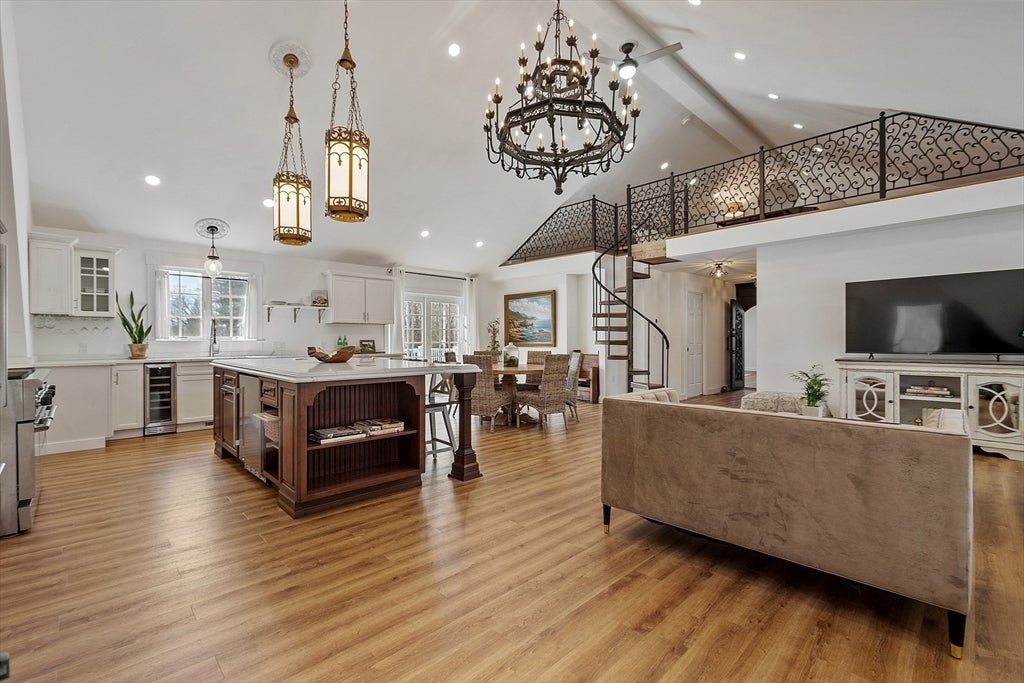 A kitchen features a large center island, stainless steel appliances, and plenty of counter space. Behind the kitchen, you’ll find steps that lead up to the lofted bedroom under the half-barrel ceiling. It measures 432 square feet.