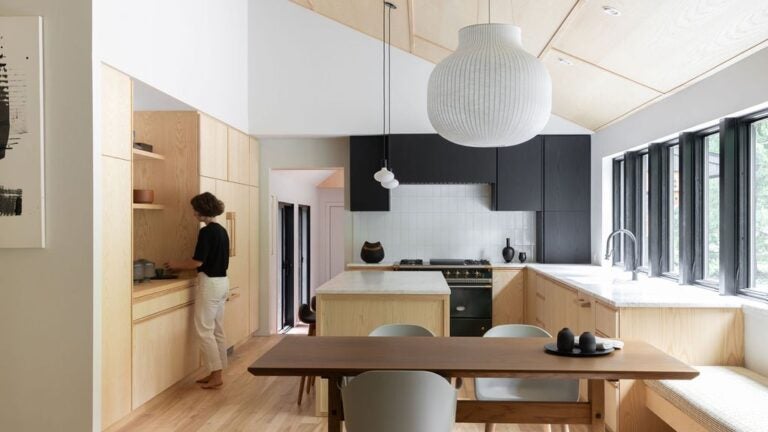 Cooney also adjusted the home’s layout slightly, adding more windows to the front of the house and pulling the kitchen forward to reconfigure its entryway. A deep green Lacanche range faces the modern limewash fireplace in the adjoining living area, and black cabinetry coordinates with the new black trim on the windows. A large paper lantern serves as a focal point over the dining table, while built-in seating and wood-lined shelves lead into the living room.