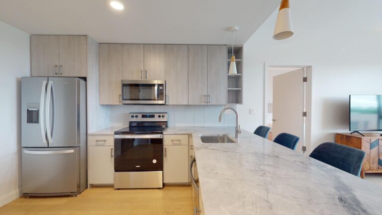 Unit 511 is a two-bed, two-bath space on the fifth floor. From the elevator, a right turn and a short stroll to the end of the hallway leads to the entrance of the 875-square-foot apartment. Step inside the bright space, which features hardwood floors throughout (except for the bathrooms), and you’re greeted with a view of Allston/Brighton and beyond from the living room windows. To one side is a kitchen featuring gray and white wooden cabinets, energy-efficient stainless steel appliances, and stylish granite countertops. Measuring more than 153 square feet, the space also offers an L-shaped, European-style bar that accommodates three seated guests comfortably. Across from the kitchen, you’ll find a coat and utility closet.