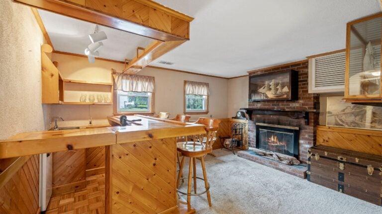 This level has an open floor plan as the family room is seamlessly intertwined with the wooden wet bar that — along with a functioning wood-burning fireplace — adds 166 square feet. The bar has a sink and a refrigerator along with seating for at least four, parquet flooring, and knotty pine wainscotting. Steps from the bar is the fireplace.