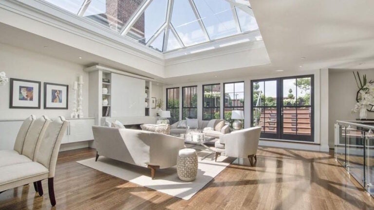 Offering 4,028 square feet of living space over two levels, this penthouse suite in Thayer Mansion sold for $10,900,000, according to the listing firm, Campion and Company. The three-bedroom home, which sold Monday, boasts a grand curving staircase and a skylight that fills the living and dining areas with light. Other highlights include a 926-square-foot private roof deck with a fireplace and a grill. The property, in a building that dates to 1884, also comes with three full and two half baths, direct elevator access, and two tandem garage parking spaces.