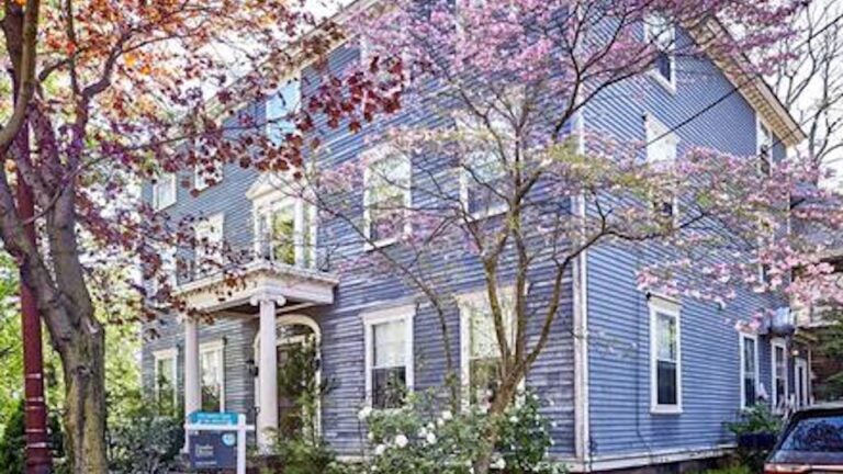 Sitting on a corner just blocks from Harvard Square, the property at 49 Hawthorn St. features views of the Charles River and a garden. It is covered in gray cedar siding and still has its original windows.