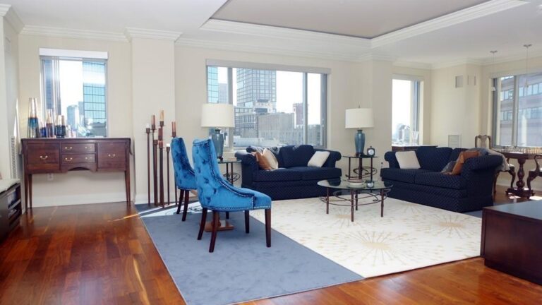 Tucked inside luxury building Trinity Place, the front-facing unit’s living room overlooks Copley Place. In 2,848 square feet, the space accommodates three bedrooms and four bathrooms.