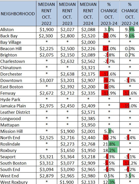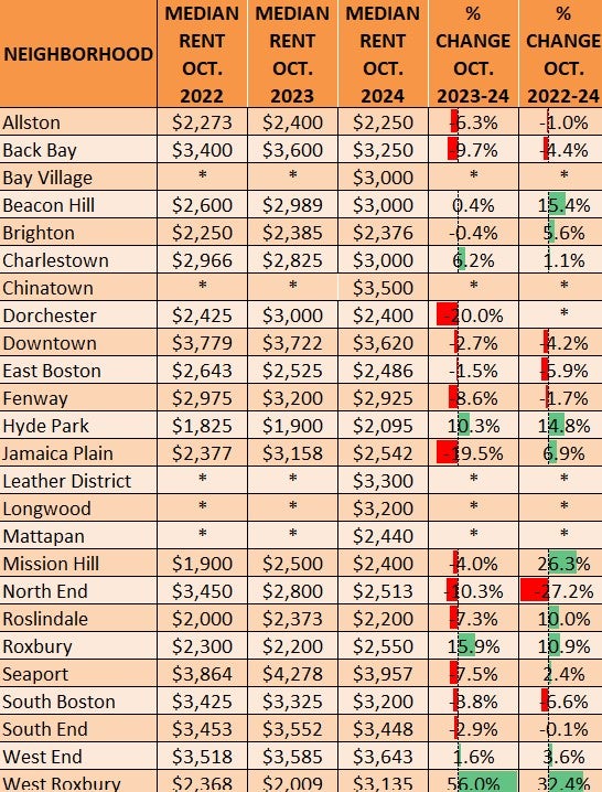 West Roxbury and Hyde Park are seeing substantial jumps in the median rents since October 2022: 24.4 percent and 13 percent, respectively. Bargain hunters may want to take a look at the Back Bay and South Boston, where prices have taken a dip.
