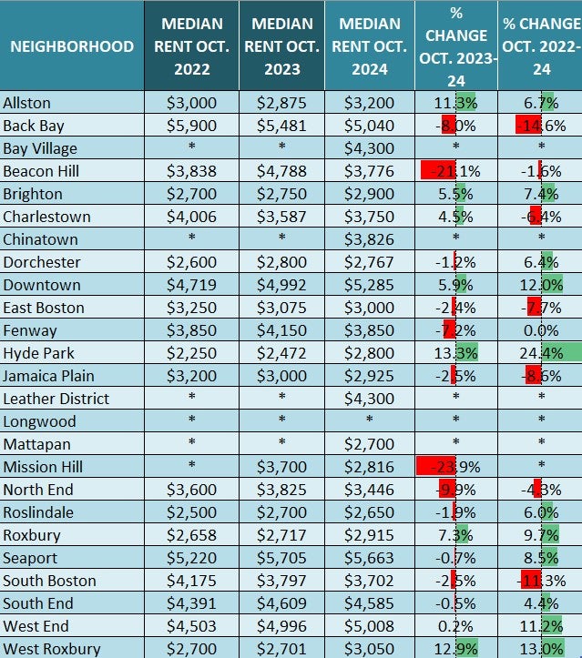 Beacon Hill may have seen only a marginal increase in prices since October 2023, but the median cost overall is up a whopping 15.4 percent in two years. West Roxbury tops it all for price gains, with a 56 percent year-over-year jump in the median asking rent.
