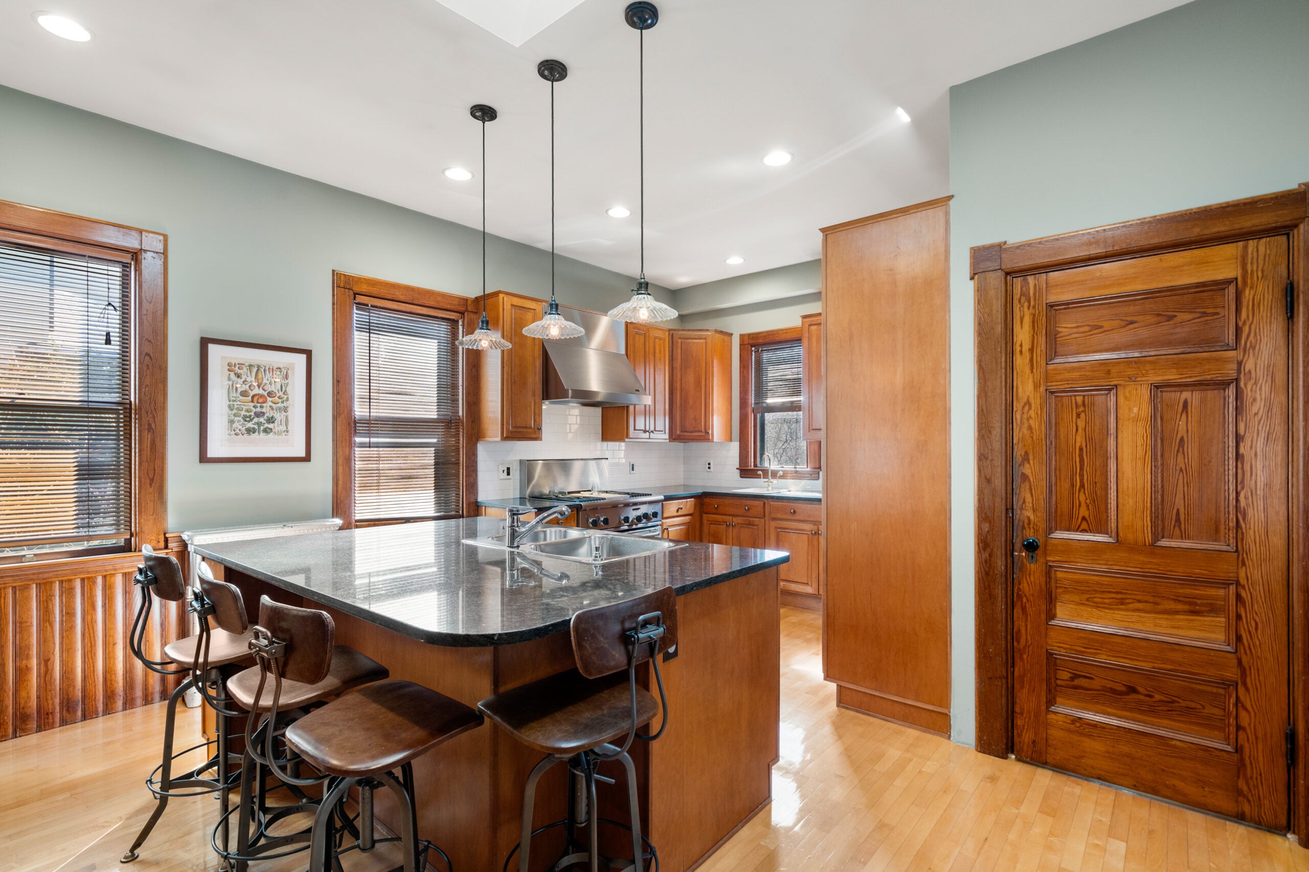 Features like the medallions on the ornate porch, patterned shingles, and stained glass remind passersby of the home’s antique status. Those historic attributes also carry into the Victorian’s roughly 3,490 square feet of living space.