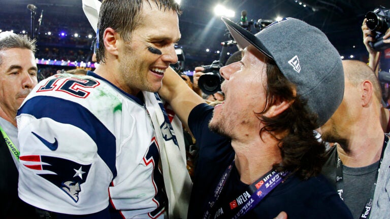 Mark Wahlberg congratulates Tom Brady after the Patriots’ Super Bowl victory.