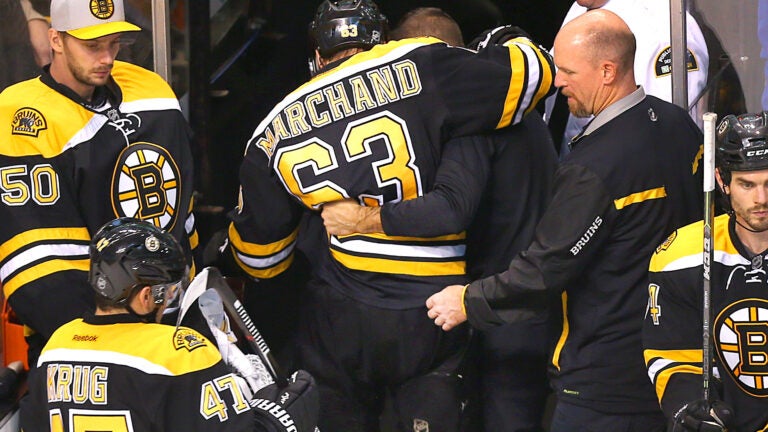 Marchand suffered the injury on what appeared to be an inadvertent elbow to the head from Dale Weise during the third period of the Bruins’ matchup against the Montreal Candiens on Saturday. The 27-year-old Bruin needed help from teammate Colin Miller to get off the ice, and leaned on physical therapist Scott Waugh on his way into the tunnel.