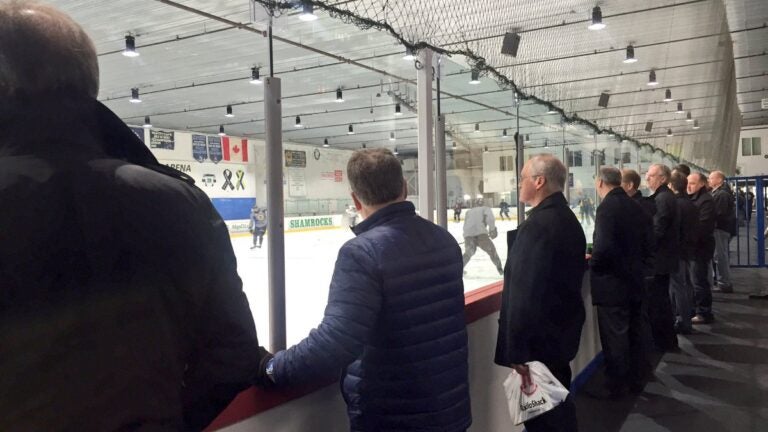 A group of dads watched their sons skate during a hockey practice on Thursday morning.