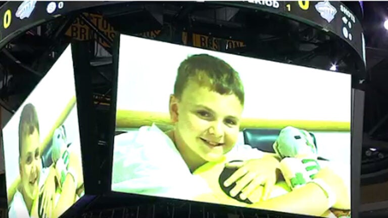 In June, 9-year-old Tommy Scardina of Marshfield received a diagnosis of NUT Midline Carcinoma, a rare form of cancer. Joined by his father before Tuesday night’s Bruins-Wild game, Scardina received an ovation from the crowd — and players from both teams — before dropping the puck at TD Garden.