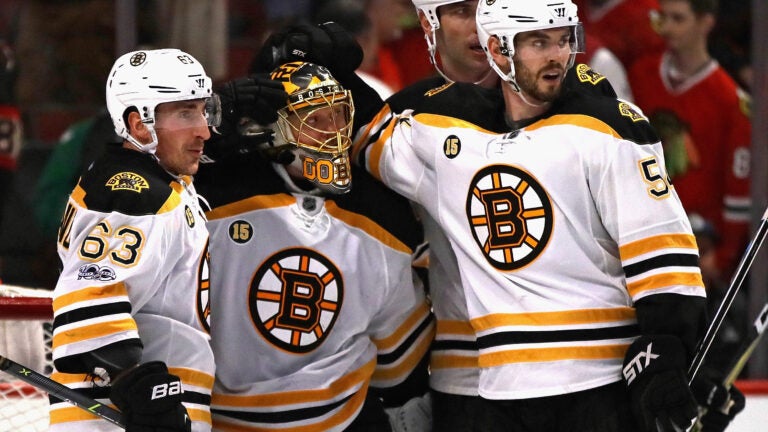 After Tuukka Rask’s win Saturday against the Florida Panthers, Khudobin filled in Sunday for the second half of the Bruins’ weekend back-to-back. The Khazah notched 41 saves helped the team hold on to a 3-2 victory — including this double pad save to deny Blackhawks winger Marián Hossa during a four-on-four in the first period.