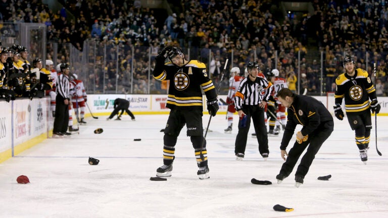 Bergeron scored again 5:36 into the second off a pass from Marchand, and Bruins fans celebrated with a wave of hats onto the ice. It was just the second career hat trick for Bergeron, whose only other three-goal game was during a 6-0 win over Ottawa on Jan. 11, 2011.