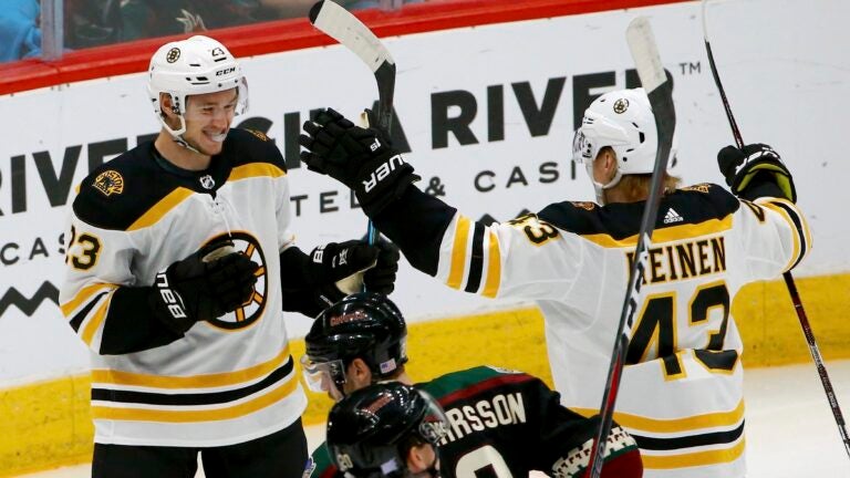 Bruins rookie forward Jakob Forsbacka Karlsson — coaches and teammates identify him by his initials — scored his first career goal 1:12 into the game, and Jake DeBrusk’s goal less than two minutes later was all Boston needed for a 2-1 victory over the Arizona Coyotes on Saturday night.