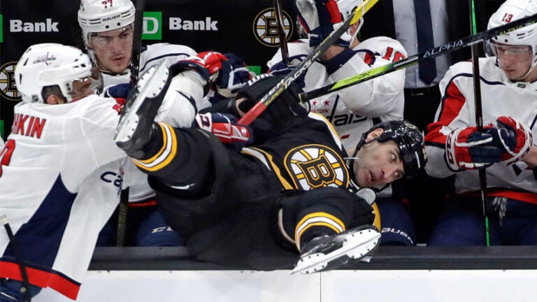 Alexander Ovechkin netted his NHL-leading 31st and 32nd goals of the season, the latter a game-sealing empty-netter with 1:35 to go, and also had the highlight hit of the game when he sent Zdeno Chara flipping head over heels into the Capitals’ bench on a shove late in the first period.