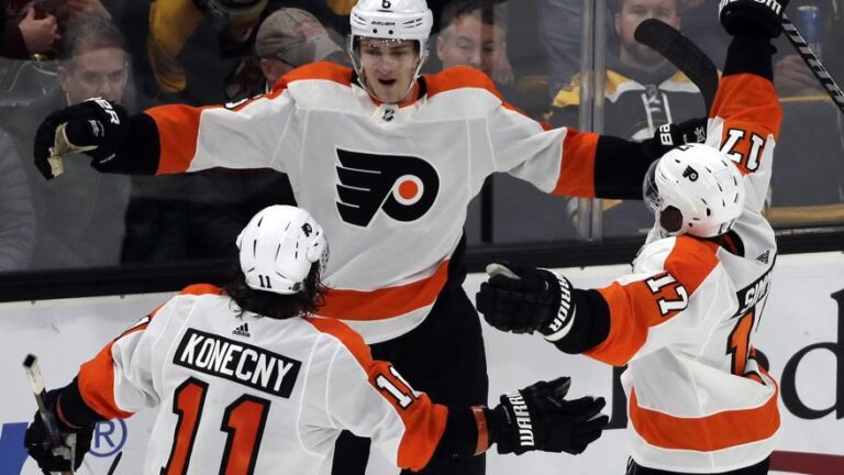 Travis Konecny, who drew the penalty on Marchand in OT, assisted with Sean Couturier on Sanheim’s winner from the left circle.