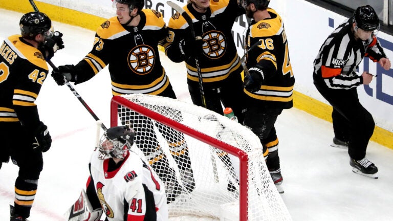 Marchand extended his points streak to six games (four goals, six assists) and has 34 points (12 goals, 22 assists) in his last 23 games. . Ottawa is 0-7-1 in its last seven meetings with Boston. . Bruins LW Jake DeBrusk was sidelined a second straight game with a lower-body injury and will also sit Sunday against the Penguins. RW David Pastrnak (left thumb surgery), RW Marcus Johannson (lung contusion) and D Kevan Miller (upper-body) won’t travel for Boston’s three-game road trip. . Senators LW Anthony Duclair (lower-body) played after blocking a shot Thursday against the Islanders and missing Friday’s practice. D Christian Jaros (hamstring) missed his third straight game. . Boston D John Moore played his 500th NHL game. . RW Lee Stempniak began his second stint with the Bruins after being recalled on an emergency basis. Stempniak, 36, re-joined the team Feb. 24 after playing 19 games with the Bruins in the 2015-16 season. . A fire on the 25th floor of a nearby high-rise building under construction caused delays for fans entering TD Garden.