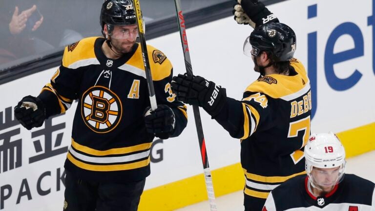 Bergeron made it 3-0 on a power-play goal with 46 seconds left in the second period, poking in a rebound of Marchand’s shot from the right circle.