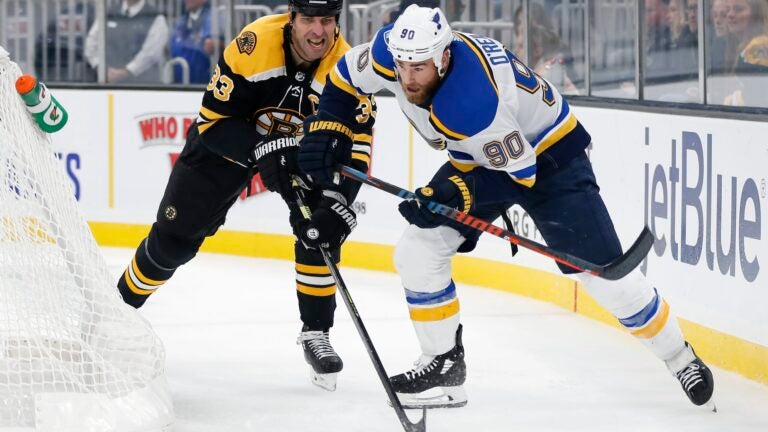 Like last spring’s Cup final, the matchup featured lots of hard hits, beginning with the first shift when Boston captain Zdeno Chara leveled winger Oskar Sundqvist in front of the Blues bench. Linemate Brayden Schenn skated in to defend Sundqvist and was sent to the penalty box — along with Chara — for matching roughing penalties.