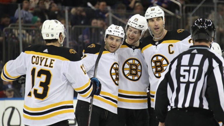 Charlie McAvoy, Charlie Coyle, and Patrice Bergeron each scored.