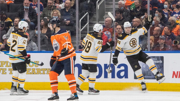 The Bruins got the game’s first goal with 3:45 left in the first period as Patrice Bergeron sprung Marchand on a short-handed breakaway, and he made no mistake putting his 10th goal of the season past Oilers goalie Stuart Skinner.