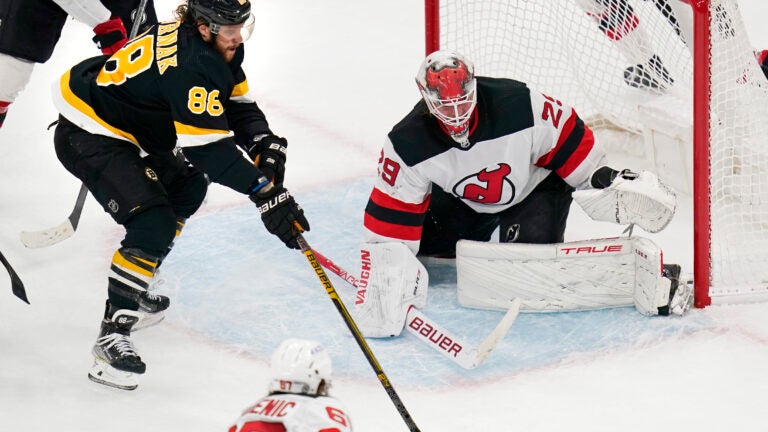 Another bounce put Boston up 3-2 late in the second when Lazar forced a turnover deep in New Jersey’s zone and Frederic took a backhand from behind the goal line and banked the puck off Blackwood’s hip.