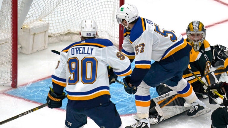 St. Louis appeared to nudge back in front with 4:09 left in the first via a Krug shot from the point that ricocheted off Swayman’s shin guard and trickled into the net.
