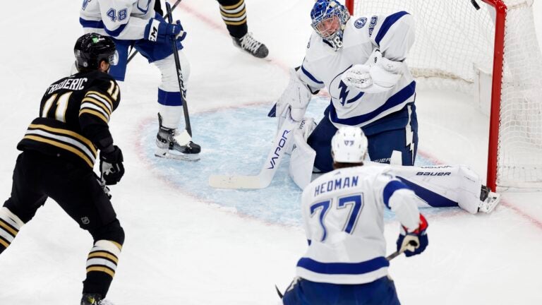 After the Bruins gave up Point’s goal 21 seconds into the game, Frederic tied it with his power-play score at 4:42. The Bruins forward got a pass in the slot, quickly shifted from his backhand to forehand and shoveled it over Vasilevskiy’s right pad.