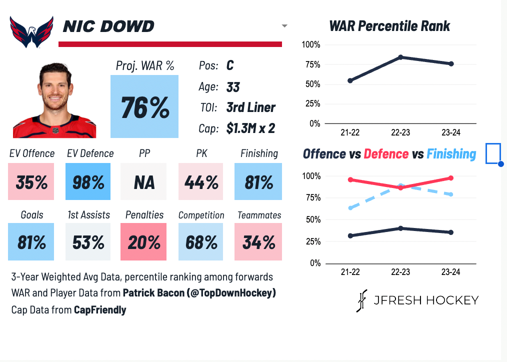 If the Bruins are looking for a lift on the fourth line who can add some defensive fortitude, Dowd is the type of veteran worth investing in. While Jesper Boqvist’s speed has added an interesting dynamic to Boston’s checking unit, the 33-year-old Dowd has strong D-zone numbers under taxing minutes, is solid in faceoffs (52.1% over six seasons in Washington), and can chip in offensively (eight goals, 16 points in 45 games).