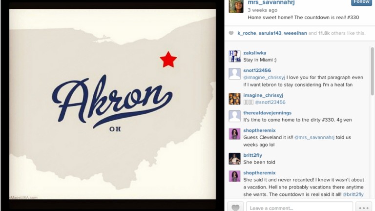 Grantland’s Matt Borcas picked up on that Instagram post at the time as he waded through the mess of rumors coming out about LeBron’s free agency plans. “The caption strikes me as calculatedly cryptic, to the point where it’s only logical to interpret Savannah’s tribute to Northeast Ohio as a message regarding her husband’s free-agency plans,’’ he wrote. Others are only now noting the Instagram post.