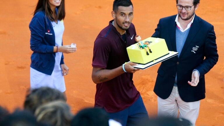 Pictured last week at the Madrid Open, Nick Kyrgios has his Kevin Garnett impression spot on.