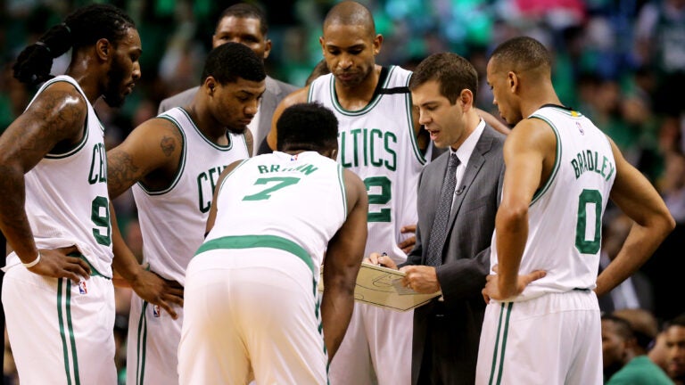 Celtics head coach Brad Stevens talks to Jaylen Brown #7, Jae Crowder #99, Marcus Smart #36, Al Horford #42 during a time out in the second half of Game 5 of the Eastern Conference Semifinals against the Wizards at TD Garden on May 10, 2017 in Boston, Massachusetts. Photo by Maddie Meyer/Getty Images