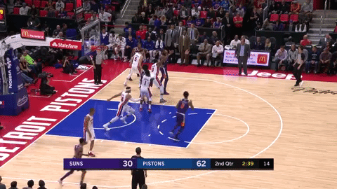 Monroe waits a full three seconds, lets the Pistons defense scramble, and then finds a high opposite shooter open for a three. In this next play, Monroe again gets a double team, but watch him escape with a dribble and let the defense make a mistake.