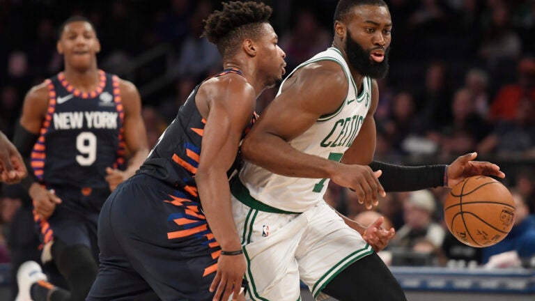 The Celtics trailed by as many as nine points in the third quarter. Kevin Knox’s long jumper put the Knicks ahead 72-63 with 7:20 left in the period, their biggest lead of the game.