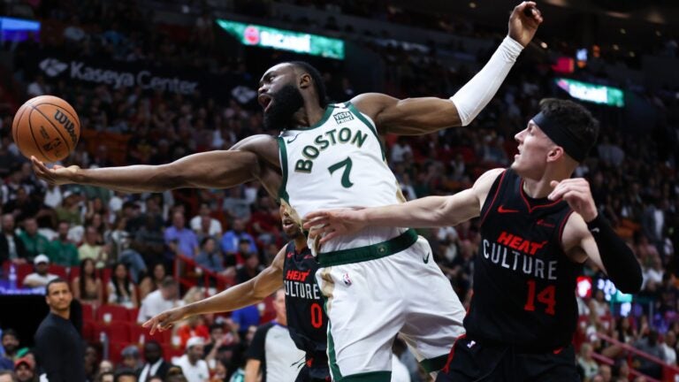 Perhaps Tatum’s best assist was his last one: With 2:38 remaining, he got a switch against Robinson and patiently waited for the double-team, which eventually arrived in the form of Caleb Martin. Tatum saw Brown cutting, but – once again, in a nod to the Celtics’ spacing – Bam Adebayo was concerned that Al Horford was open above the break.