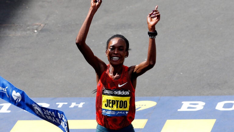 Rita Jeptoo, of Kenya, breaks the tape to win the women’s division, her second staight Boston title and her third overall.