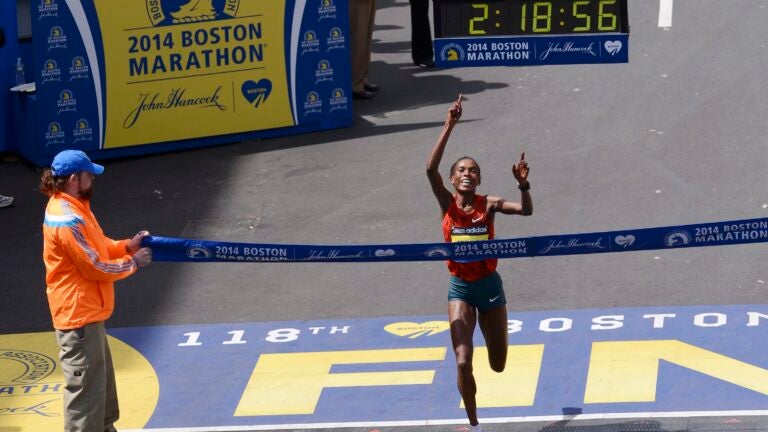 This GIF posted on BostInno via Hayden Bird shows Kenyan female runner and Elite Women’s champion Rita Jeptoo cruising past a Green Line train on route to her course record 2:18:57 finish.