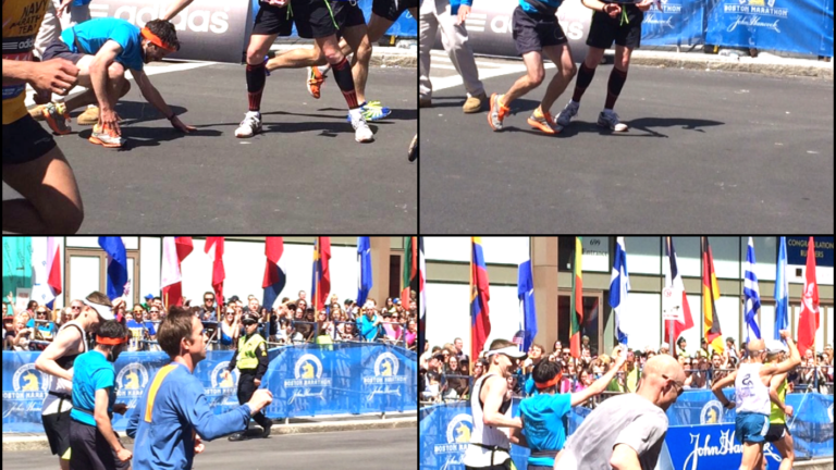 Boston.com reporter Steve Safran captured the above photos of a fallen runner, and a competitor helping him back on his feet. The exchange happened just 50 yards from the finish line.