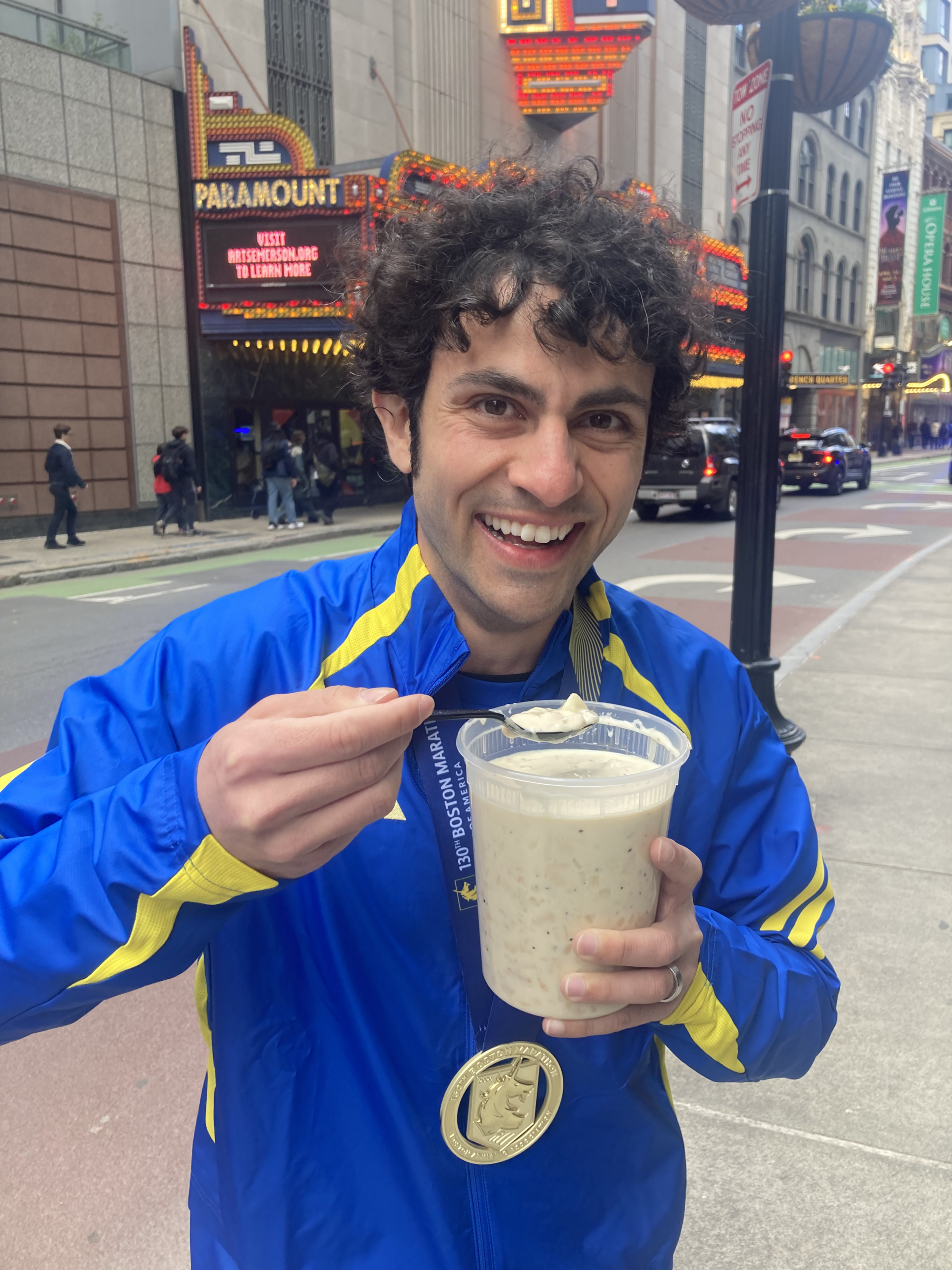 After the first two Boston Marathons, he said, “I was shivering to death and love clam chowder a little too much.”