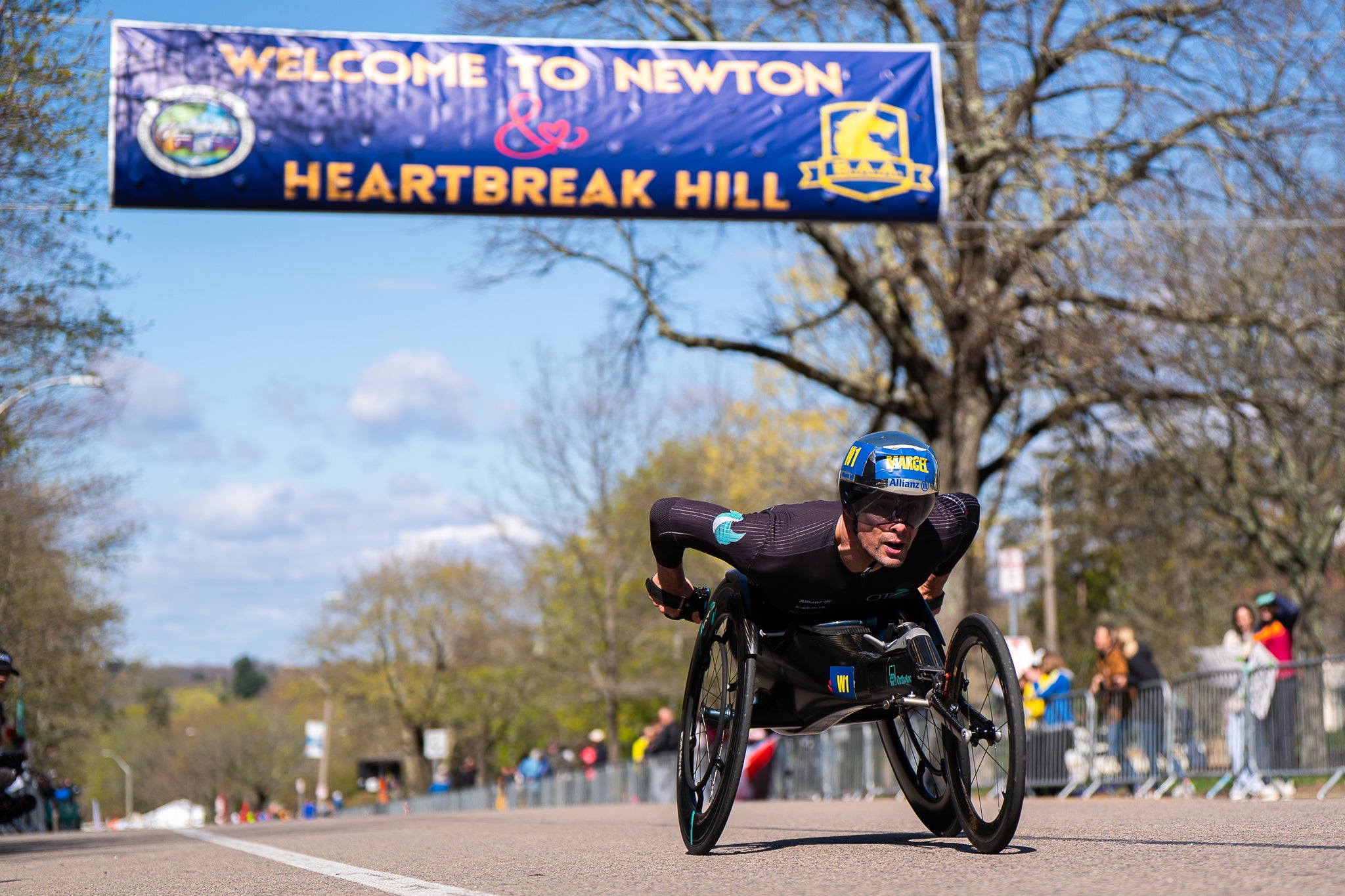 Marcel Hug, of Switzerland, is looking to win his ninth Boston Marathon. He dominated the field in 2024, setting a course record of 1:15:33 despite crashing into a barrier as he made the famous “firehouse turn” in Newton. Last year, he won with a time of 1:21:34.