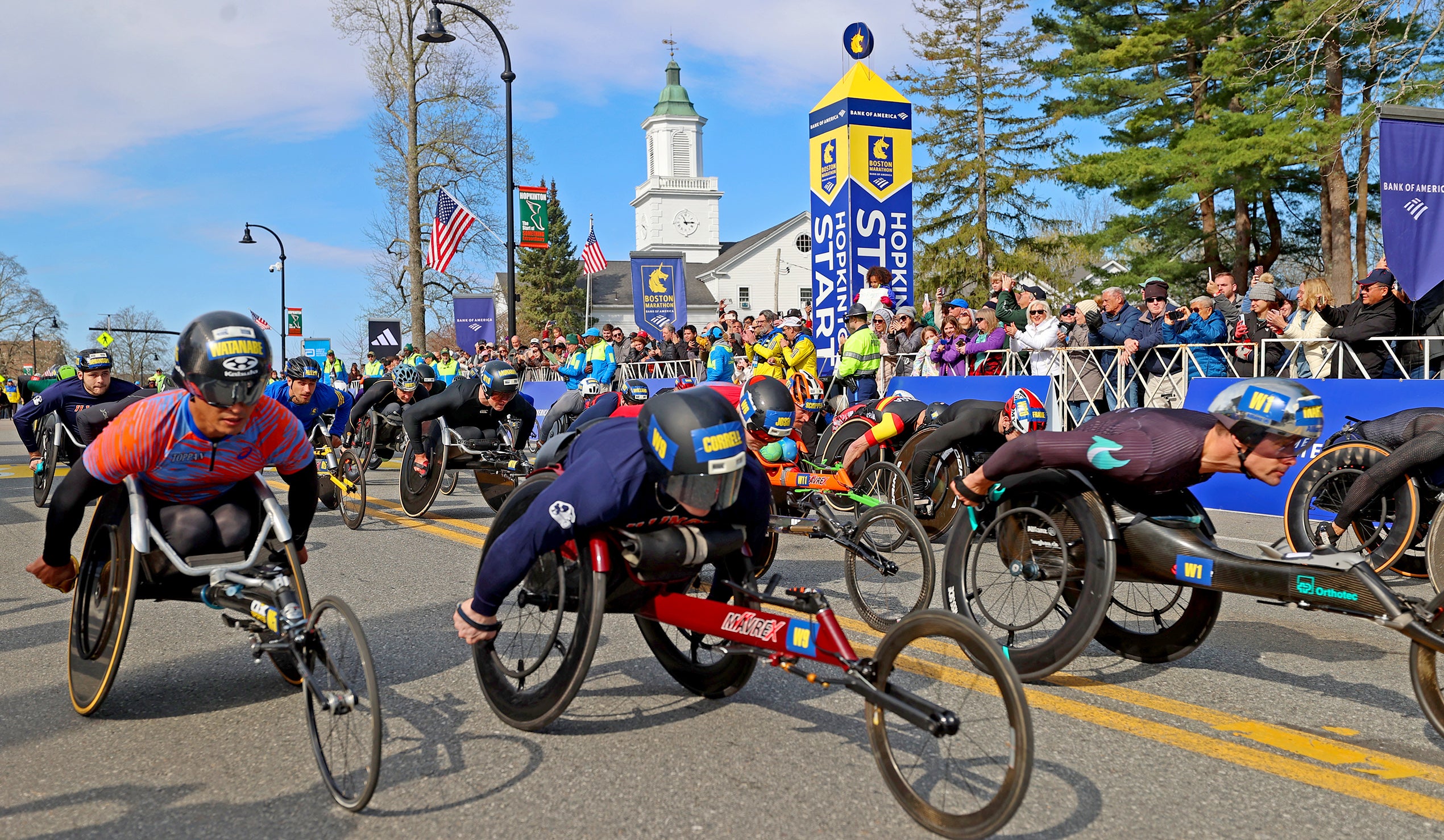 The men competing in the marathon’s wheelchair division departed from Hopkinton at 9:06 a.m., followed by the women at 9:09 a.m.
