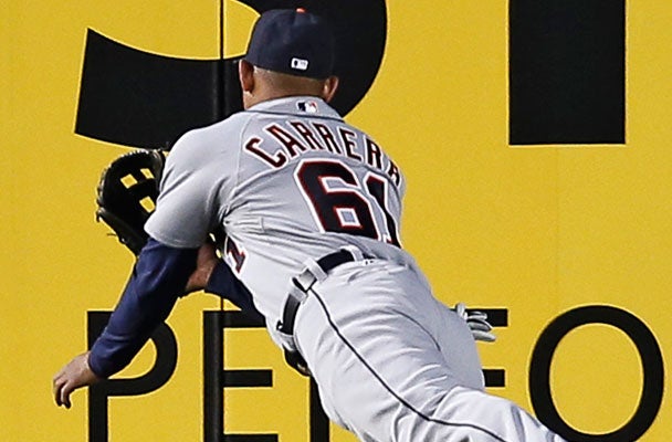 Tigers center fielder Ezequiel Carrera robbed Yankees outfielder Jacoby Ellsbury of extra bases Monday night, going all-out to make this catch with the bases loaded in the third inning.
