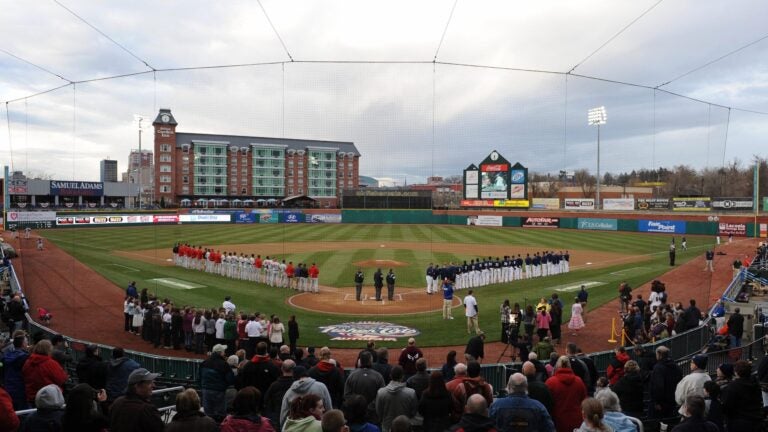 The view from Northeast Delta Dental Stadium’s Sam Adams Bar and Grill in left field.