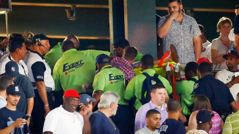 The fall immediately followed the introduction of Yankees slugger Alex Rodriguez as a pinch hitter. The game wasn’t delayed while medical personnel treated the man for about 10 minutes, applying CPR before putting him on a backboard.