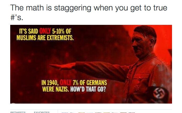 The now-deleted tweet contained a meme that read: “It’s said only 5-10% of Muslims are extremists. In 1940, only 7% of Germans were Nazis. How’d that go?’’