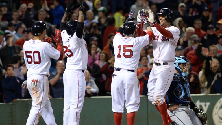 A member of Boston’s World Series title team in 2013, he was honored with a video tribute after the second inning and came out of the dugout for a curtain call.