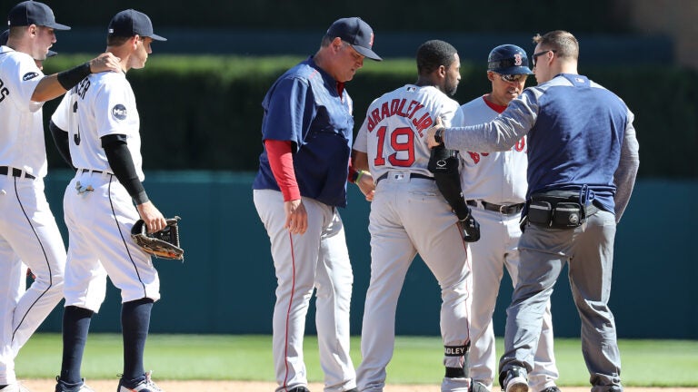 Bradley sprained a ligament in his right knee Saturday when his cleat appeared to grab some of the Comerica Park clay in Detroit.