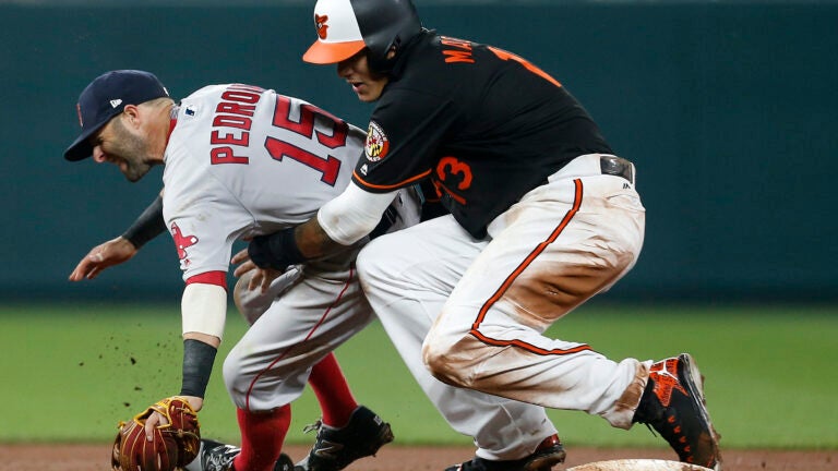 At the bottom of the eighth inning, Baltimore’s Mark Trumbo hit a weak ground ball to Red Sox shortstop Xander Bogaerts. Bogaerts threw the ball to Pedroia for the easy force-out at second, but before Pedroia could turn to fire the ball to first baseman Mitch Moreland, his legs went out from under him.