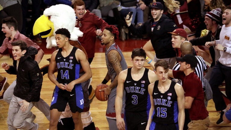 After taking down Duke’s top-ranked men’s basketball team Saturday afternoon, the Eagles home crowd swarmed the court in Chestnut Hill.