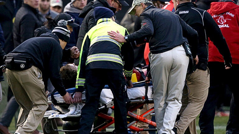 Harvard quarterback Tom Stewart taken off on stretcher